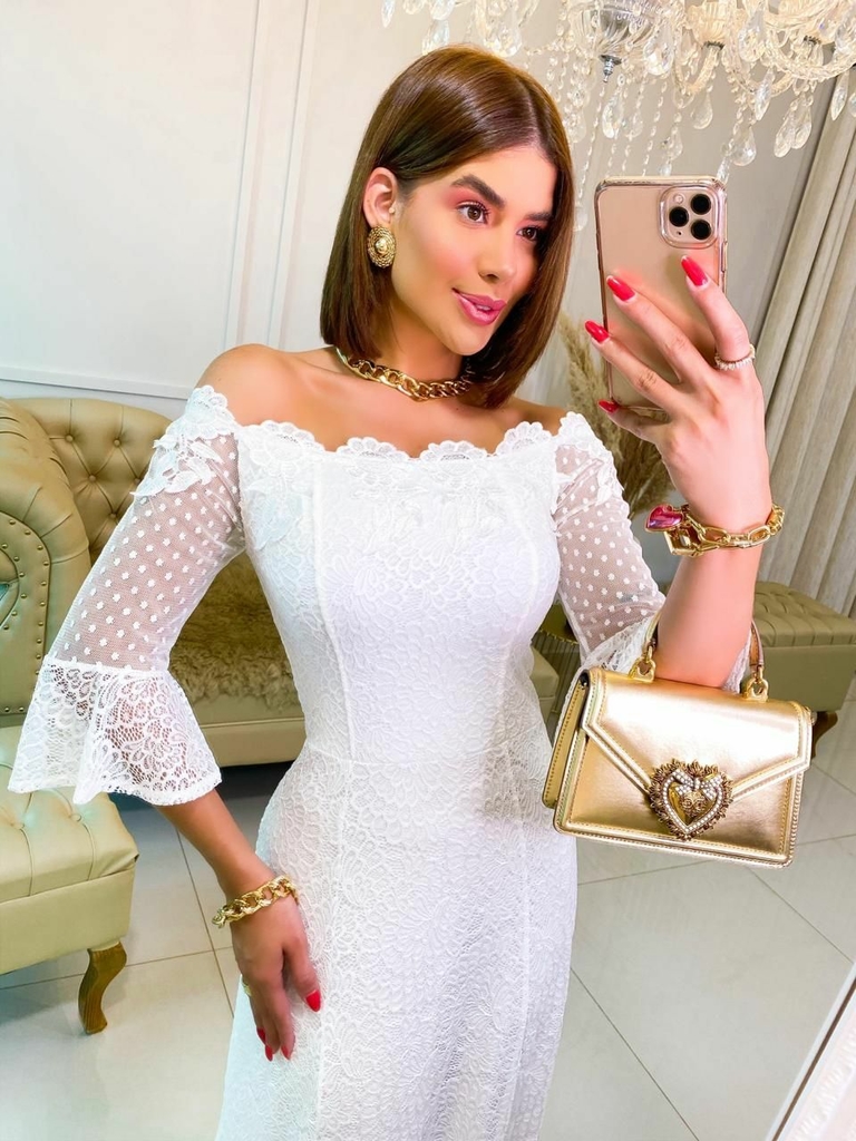 Vestido Midi Branco de Renda Noiva